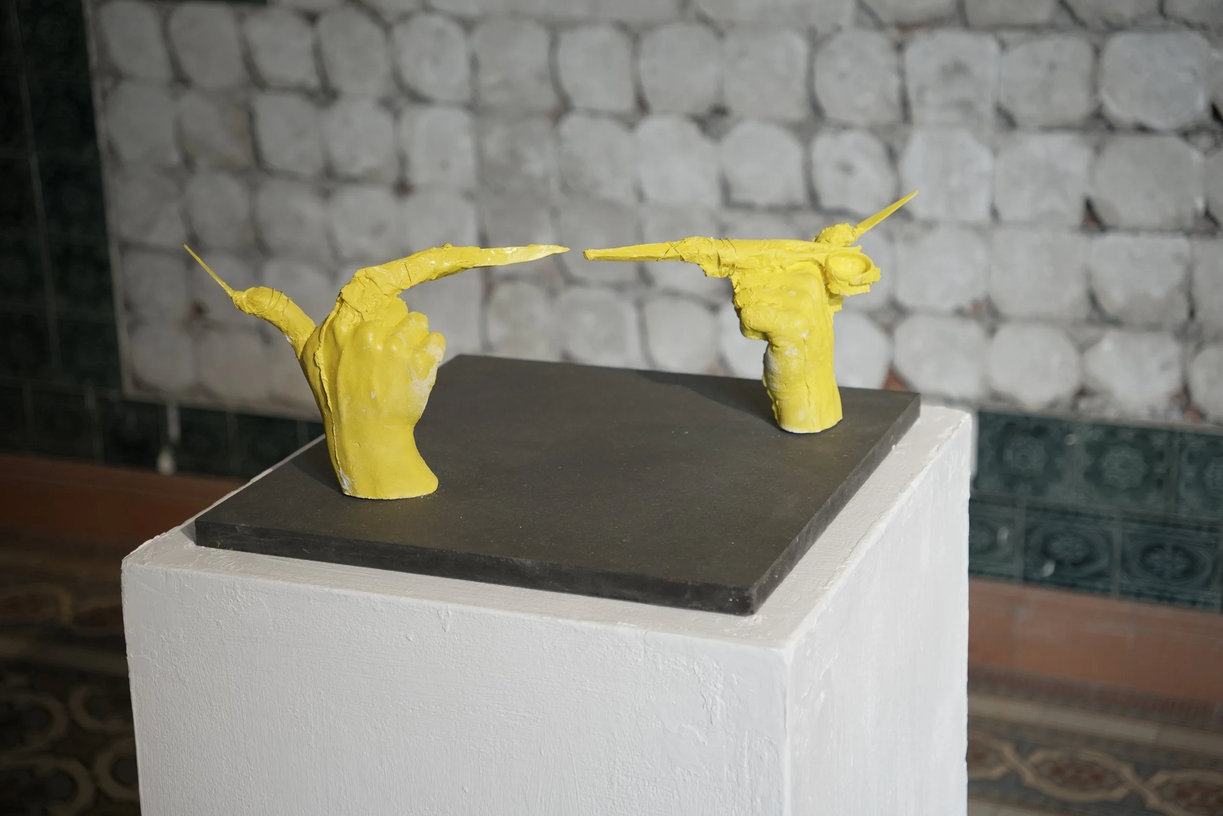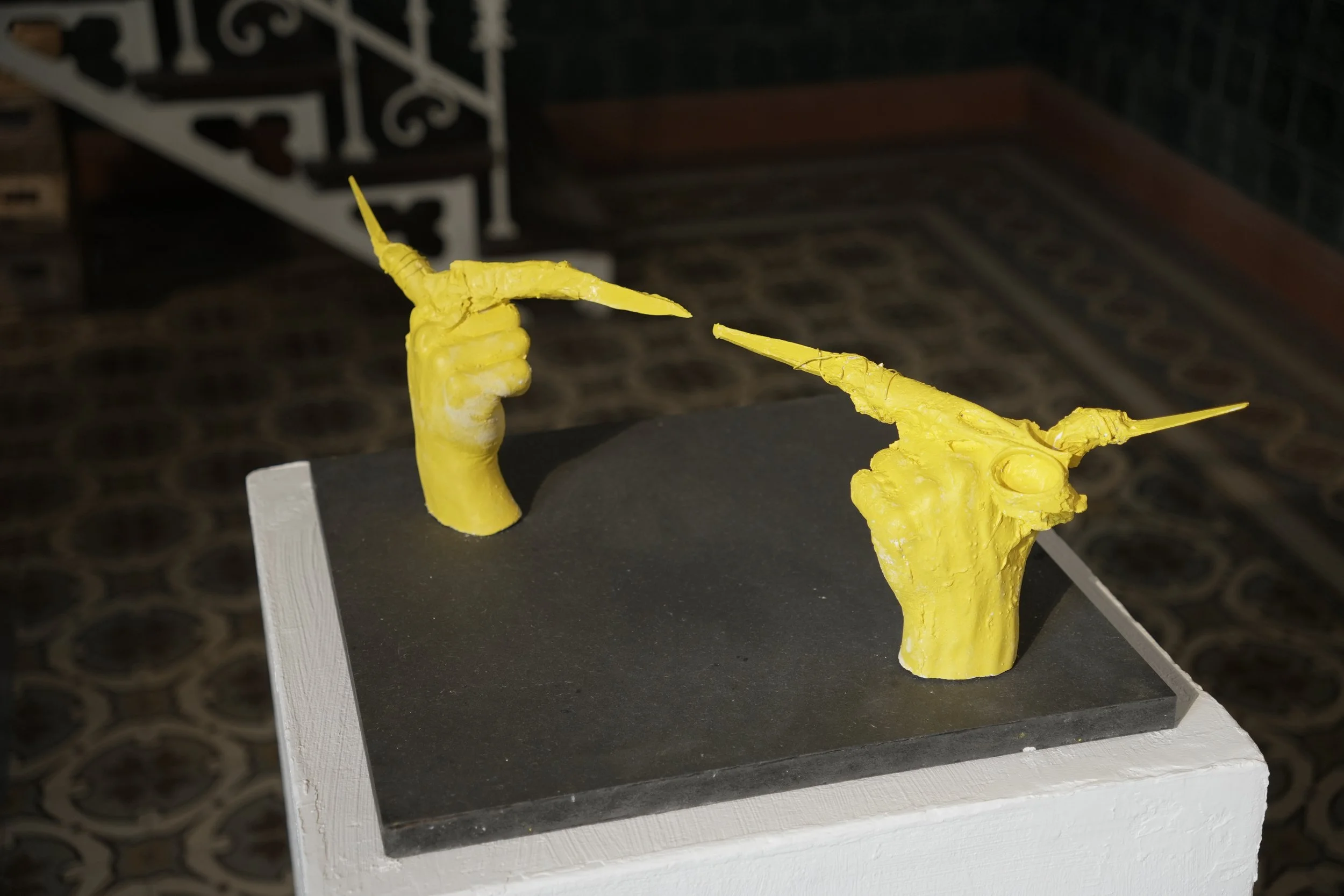 Through layered textures, cut-out elements, and delicate materials, the artwork visualizes the tension between proximity and distance. The โ๐๐โ gesture, commonly used online to convey shyness, hesitation, or affection, serves as a metaphor for fragile communication in the digital age. Meanwhile, the influence of Edward Scissorhands underscores the impossibility of human contact without consequences, highlighting vulnerability, isolation, and unintended destruction.